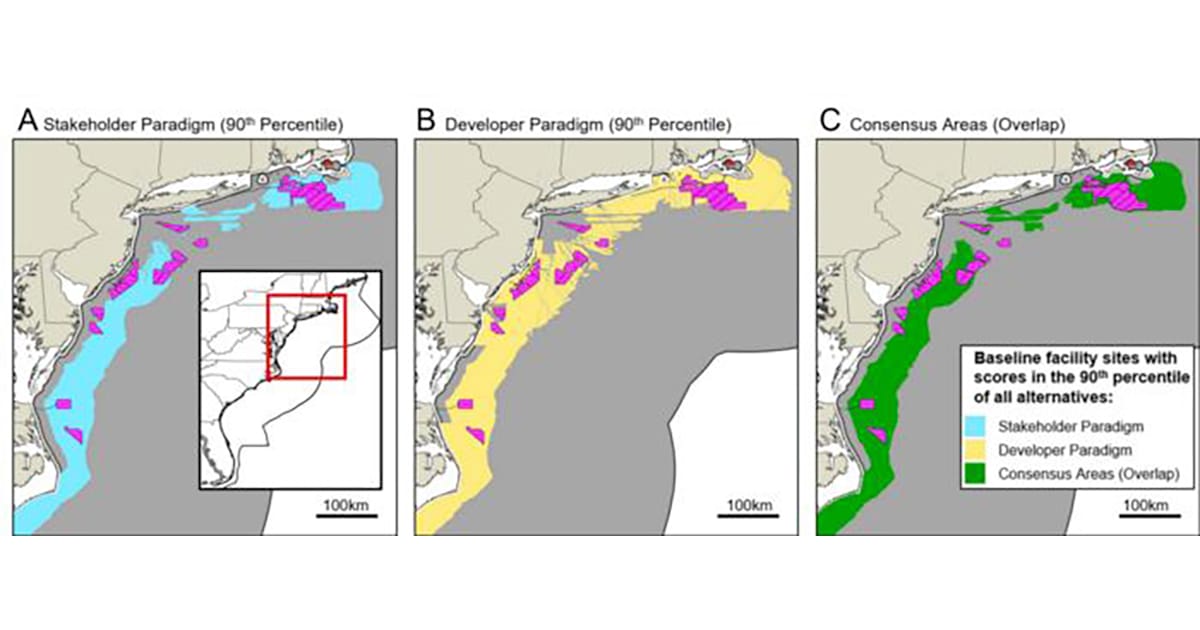 The authors mapped areas that both developers and external stakeholders would likely consider suitable, which, on the East Coast, has the potential for 600 GW of power. On the West Coast, consensus areas are scarce, with only potential for 5 GW of power owing to greater depths nearshore that limit the possible development area. Using unmoored floating turbines and power-to-hydrogen—which does not require transmission cables—might increase the consensus areas on the West Coast, albeit at greater investment costs. Investment tax credits currently in place may help develop plants that are more socio-environmentally suitable.