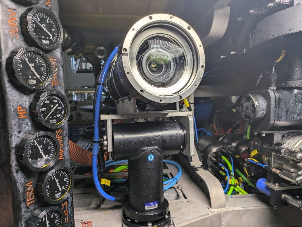 To capture groundbreaking underwater content, BBC Studios and Marine Imagine Technologies designed a deep ocean-rated camera system integrated with a telemetry bottle, which is the central hub for communications on the submersible. However, during the Arctic expedition, the crew encountered challenges connecting the camera system to the ROV’s telemetry bottle due to a missing optical fiber connector critical to establishing communications for the system. Without this essential part, the team faced a significant delay in capturing underwater footage.