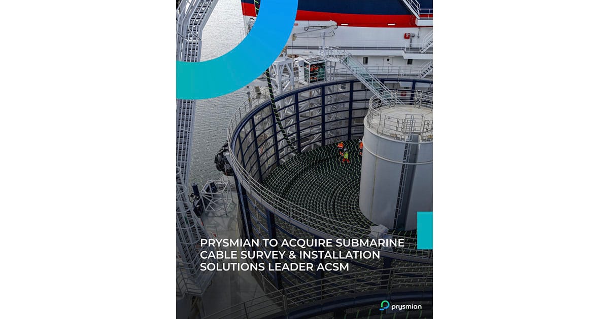 Prysmian will acquire ACSM, a Spain-based leader in solutions for submarine cable installation, including subsea surveying, route planning, and seabed preparation activities with over 20 years of experience in the offshore cable sector.